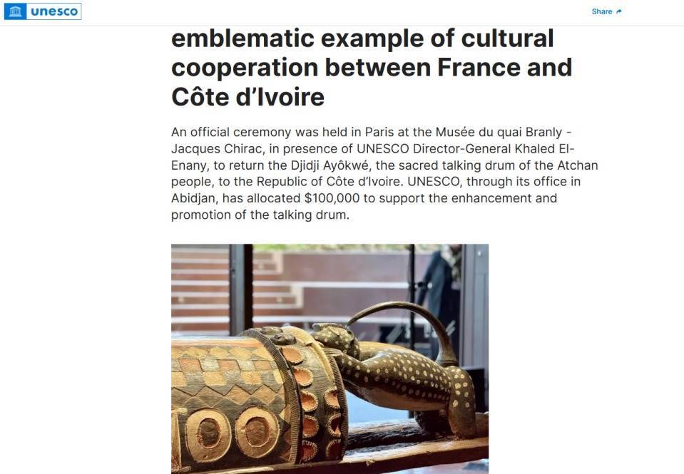 r“会说话的鼓”是法国向科特迪瓦归还的第一件文物。科特迪瓦还在追索其他近150件文物。联合国教科文组织表示,此次文物归还,标志着非洲被殖民列强掠夺文化遗产的修复工作又迈出重要一步,为全球文物返还行动树立了新典范。