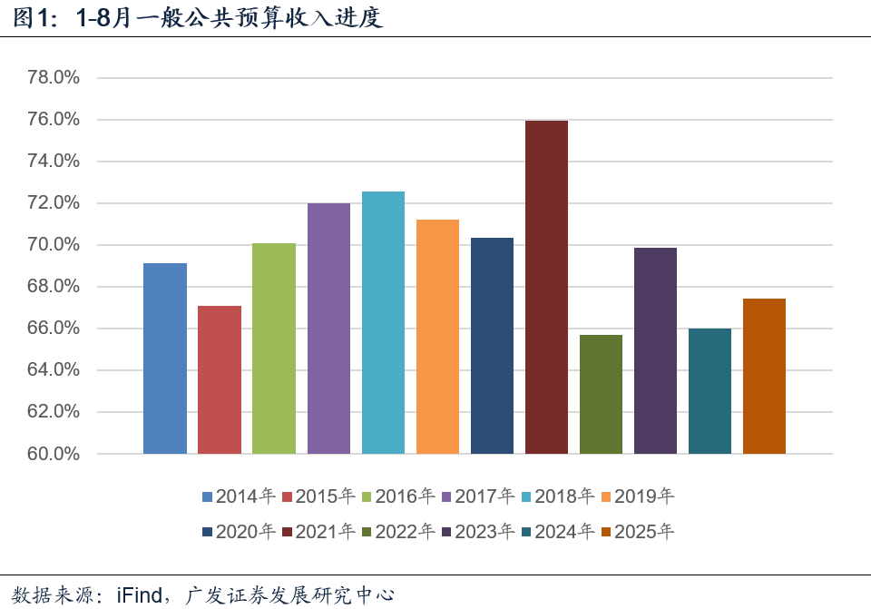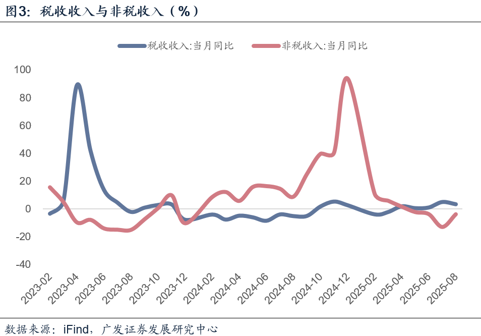 1-8月,一般公共预算收入累计同比0.3%(前值0.1%),超出年初预算目标增速0.2个百分点,但差距并不明显;因此四季度财政收入增速若出现边际下行趋势,则全年财政收入表现可能低于年初目标,如2015年、2019年、2022-2024年。其中,税收收入累计同比0.0%(前值-0.3%,年初目标3.7%);非税收入累计同比1.5%(前值2.0%,年初目标-14.2%)。