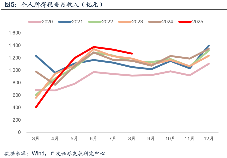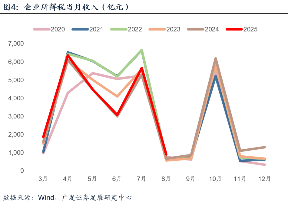 第二,8月企业所得税、个人所得税和国内增值税均表现较好,当月同比分别录得33.4%、9.7%和4.4%。8月本身为企业所得税收入小月,弹性较大。从基本面角度来看,一是今年企业盈利节奏上是“1-4月上行、5月大幅回调、6-7月修复”,尤其是“两新”相关的中游行业规上企业较多,带动了制造业企业的纳税增长。二是高技术产业、文旅产业为代表的服务消费8月销售收入同比较高。三是资本市场活跃带动证券业和保险业税收增速分别超过70%、10%,而企业投资收益、股票分红增加,也带动7-8月企业所得税和个人所得税增收。四是今年以来税务层面加强监管,个人所得税和企业所得税的违规偷漏税空间也明显缩小。8月契税、土地增值税等同比降幅扩大。