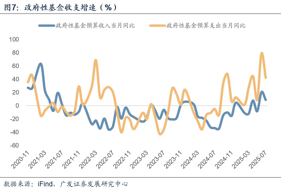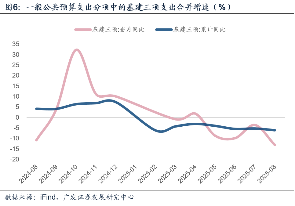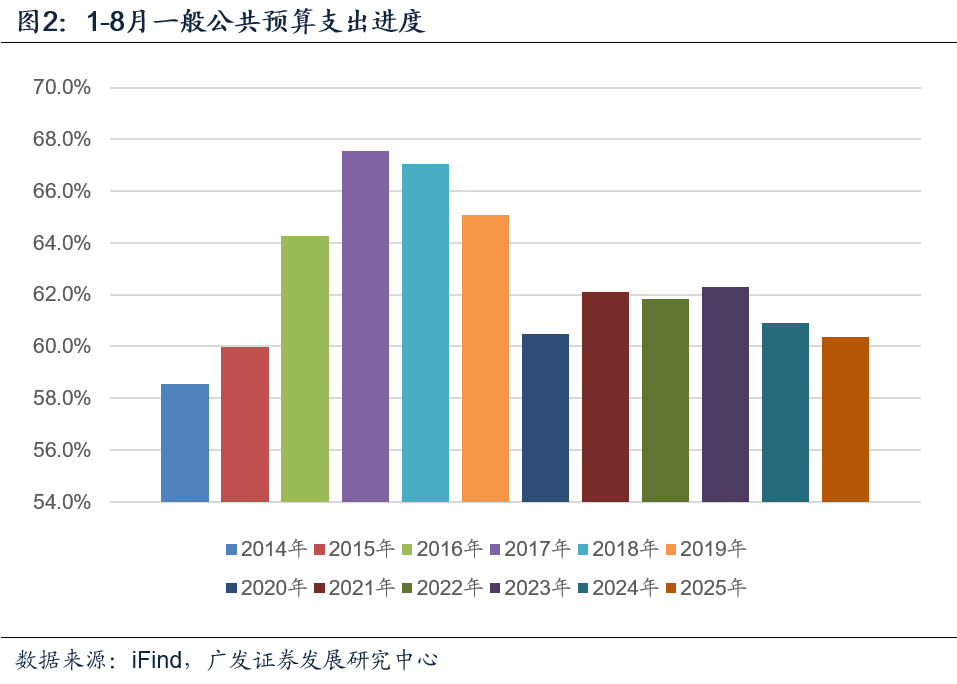 在收入较强的前提下,8月支出则意外边际放缓,在低基数的前提下,同比增速依然较7月下滑2.2个百分点至0.8%。8月支出进度6.3%,较2015-2024年同期平均水平(7.1%)明显偏低。这一变化主要来自基建相关配套支出的放缓,农林水事务、城乡社区事务、交通运输支出同比分别录得-22.9%、-16.8%、18.1%(低基数),三项合并后的支出增速为-13.2%(前值-3.6%)。