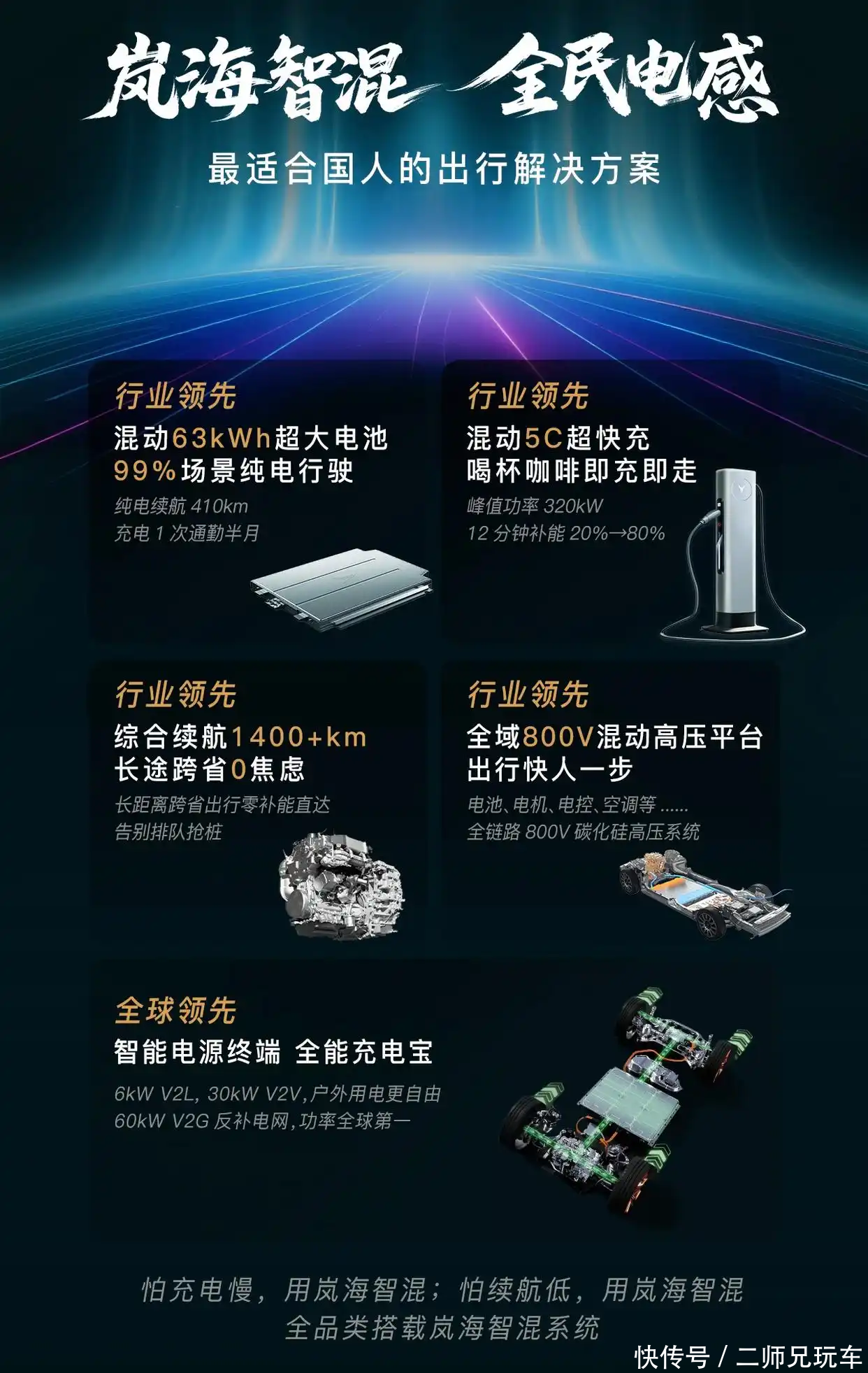 其次是岚海智能超混系统。这是全球首个全品类的800V高压混动技术,可实现5C超级快充,20-80%充电时间仅为12分钟,同时还能实现CLTC工况下410km的纯电续航以及1400km的综合续航。