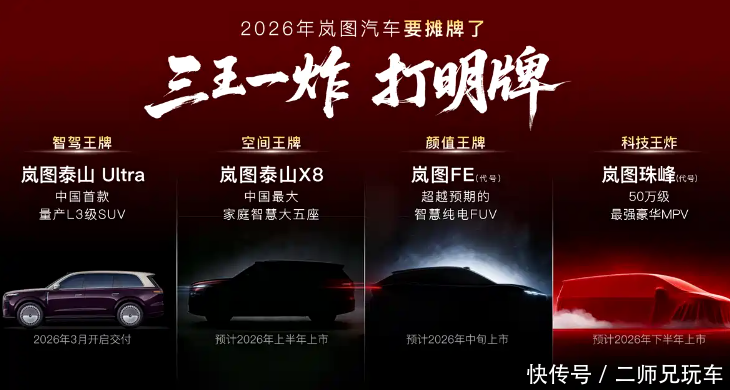 这4款车被岚图汽车内部称为“三王一炸”,包括:中国首款量产L3级SUV岚图泰山Ultra、“庭院级大五座SUV”岚图泰山X8、与华为乾崑联合开发的智慧纯电FUV(代号FE),以及定位“50万级行业最强”的MPV(代号珠峰)。