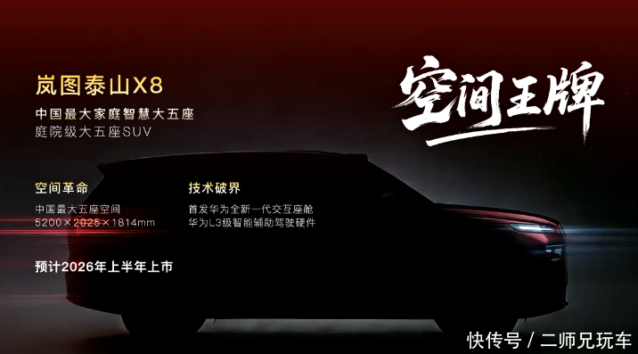 岚图泰山X8同样搭载华为四激光雷达系统,并将首发华为全新一代交互座舱。尺寸方面,泰山X8长宽高分别达到5200/2025/1814mm,定位为五座大型SUV,它将填补岚图品牌在大五座旗舰SUV领域的空白。